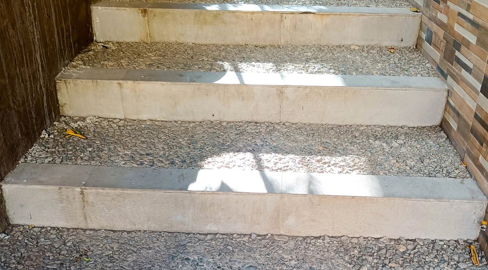 Éclats / épaufrures : angles cassés (nez de marche), béton friable sur 5–20 mm.