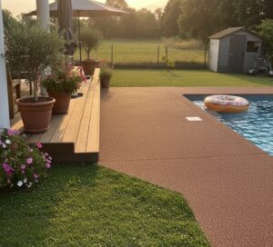 Malin sur terrasses exposées où l’on peut viser une teinte claire (blanc cassé, sable, gris perle) et une sous-couche drainante raccordée à un exutoire : on cumule réflexion solaire et évaporation maîtrisée. Sur plages de piscine, l’adhérence est un plus ; restez sur des mélanges clairs et évitez les agrégats très sombres qui montent en température.